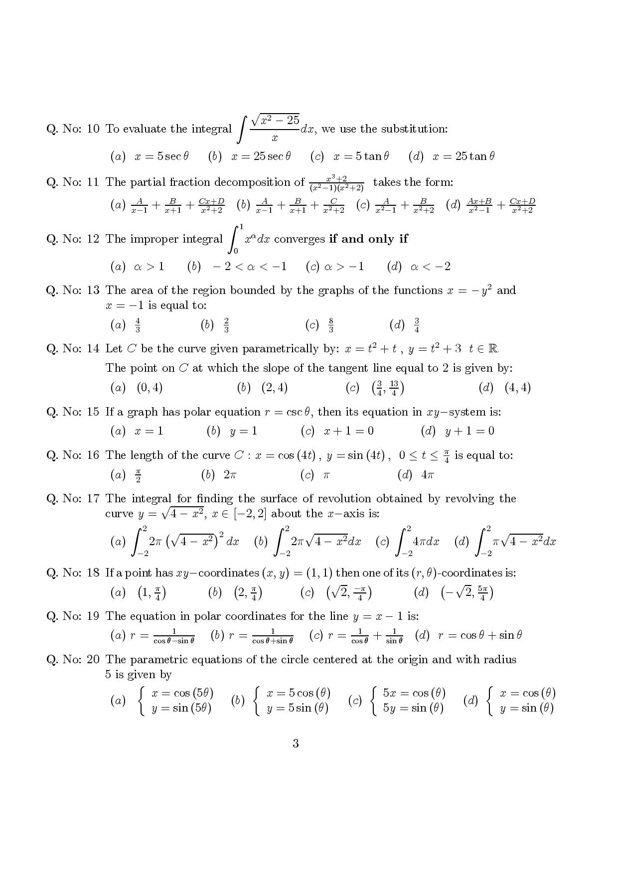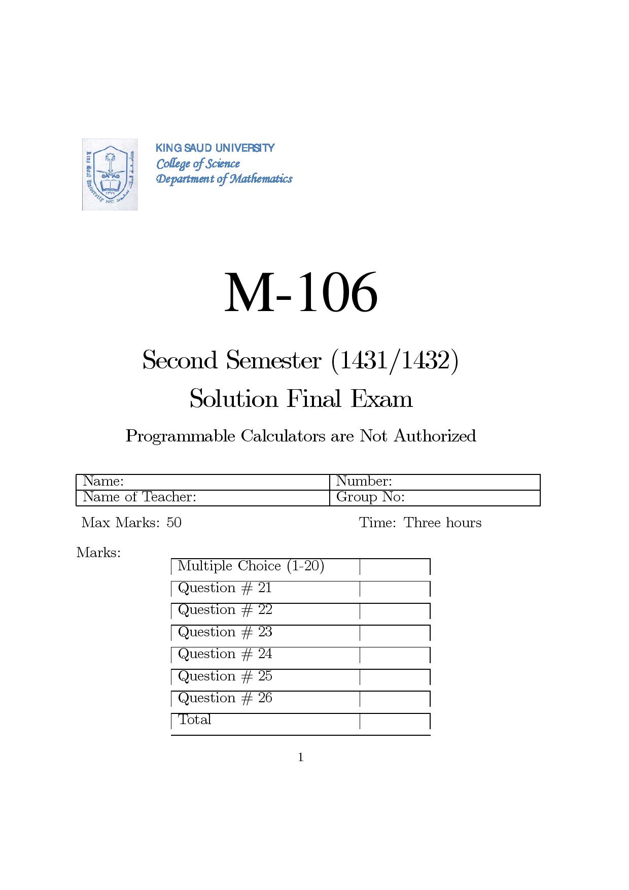 اسئلة اختبار  نهائي ريض 106 حساب التكامل الفصل الثاني 1432هـ  جامعة الملك سعود