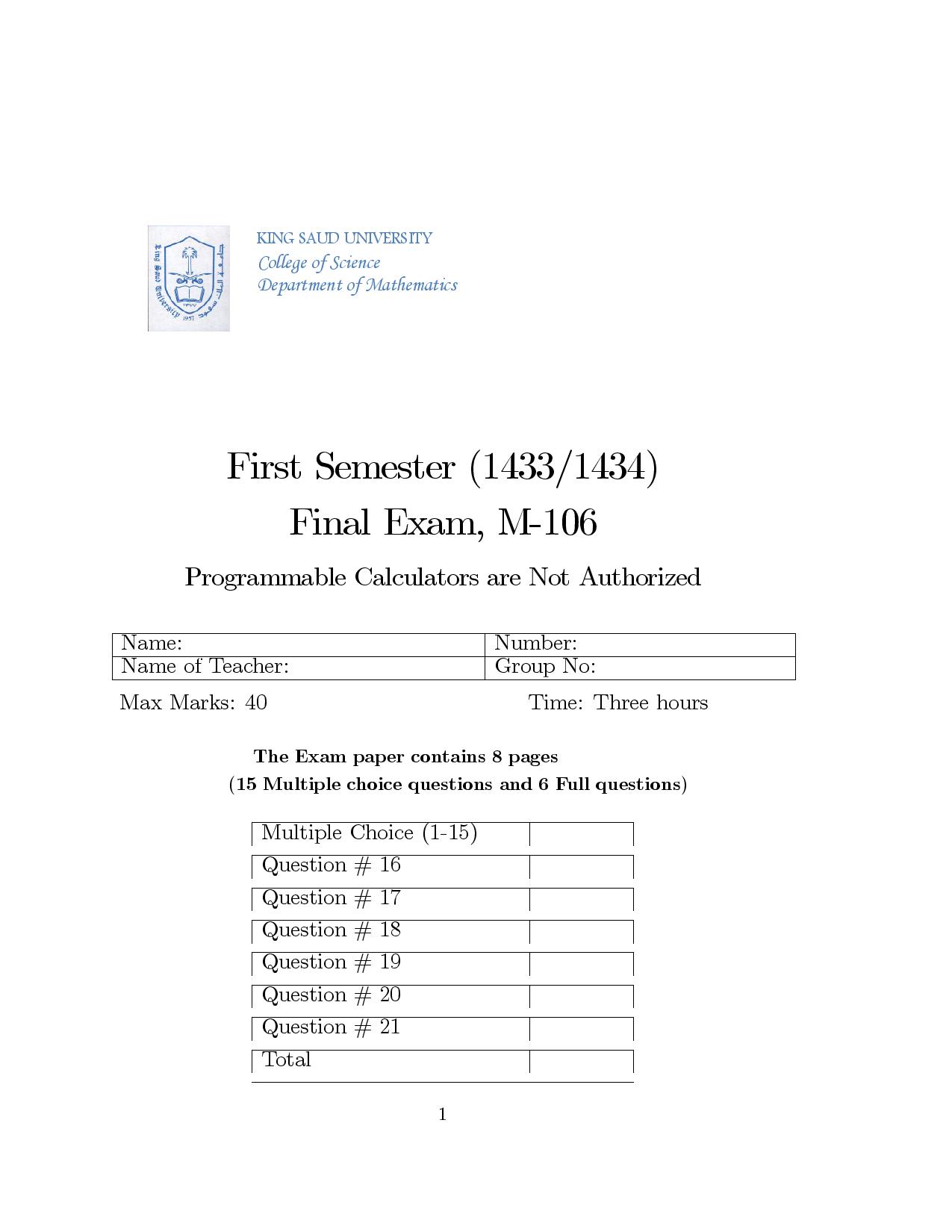 اسئلة اختبار نهائي  ريض 106 حساب التكامل الفصل الأول 1434هـ جامعة الملك سعود