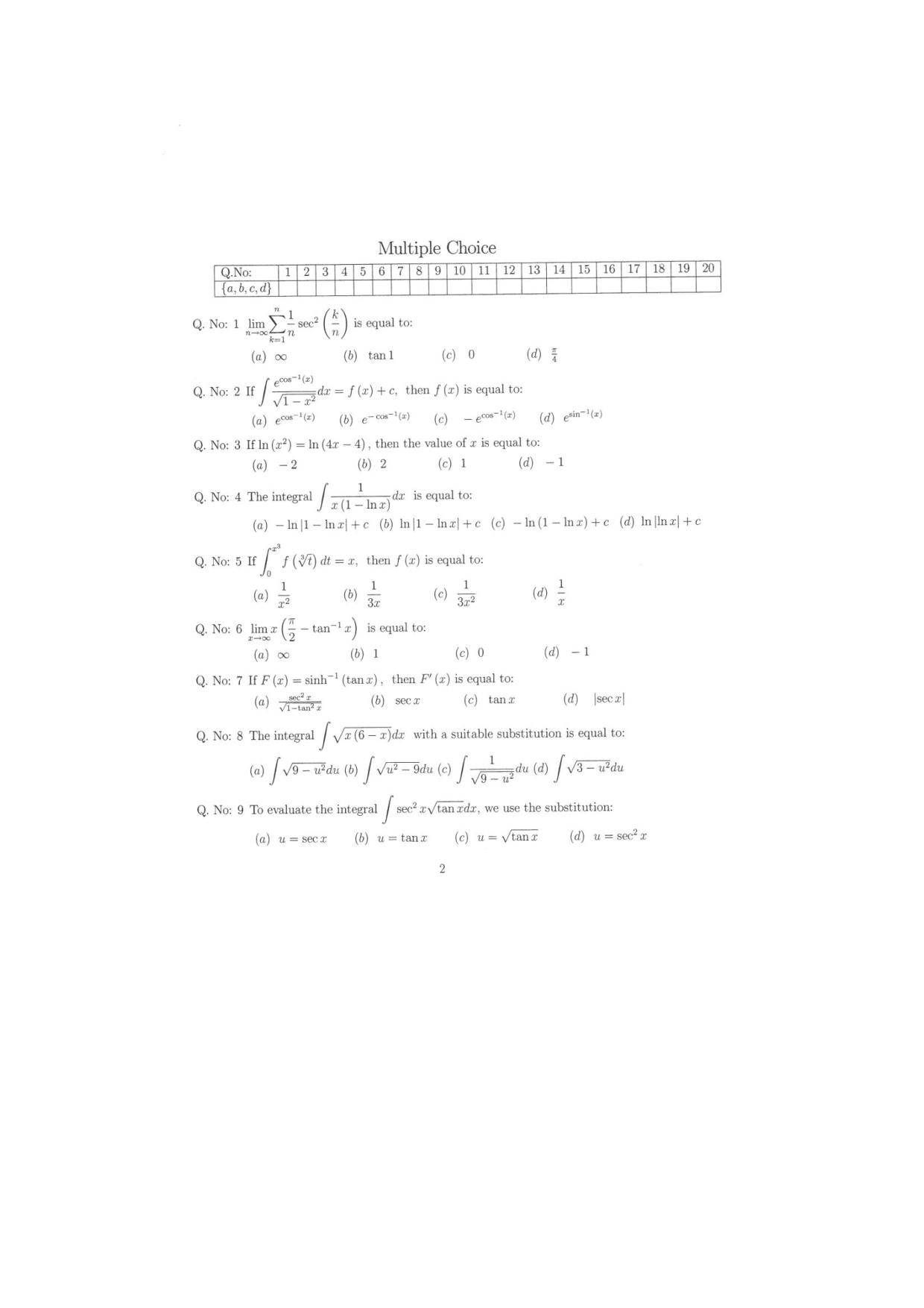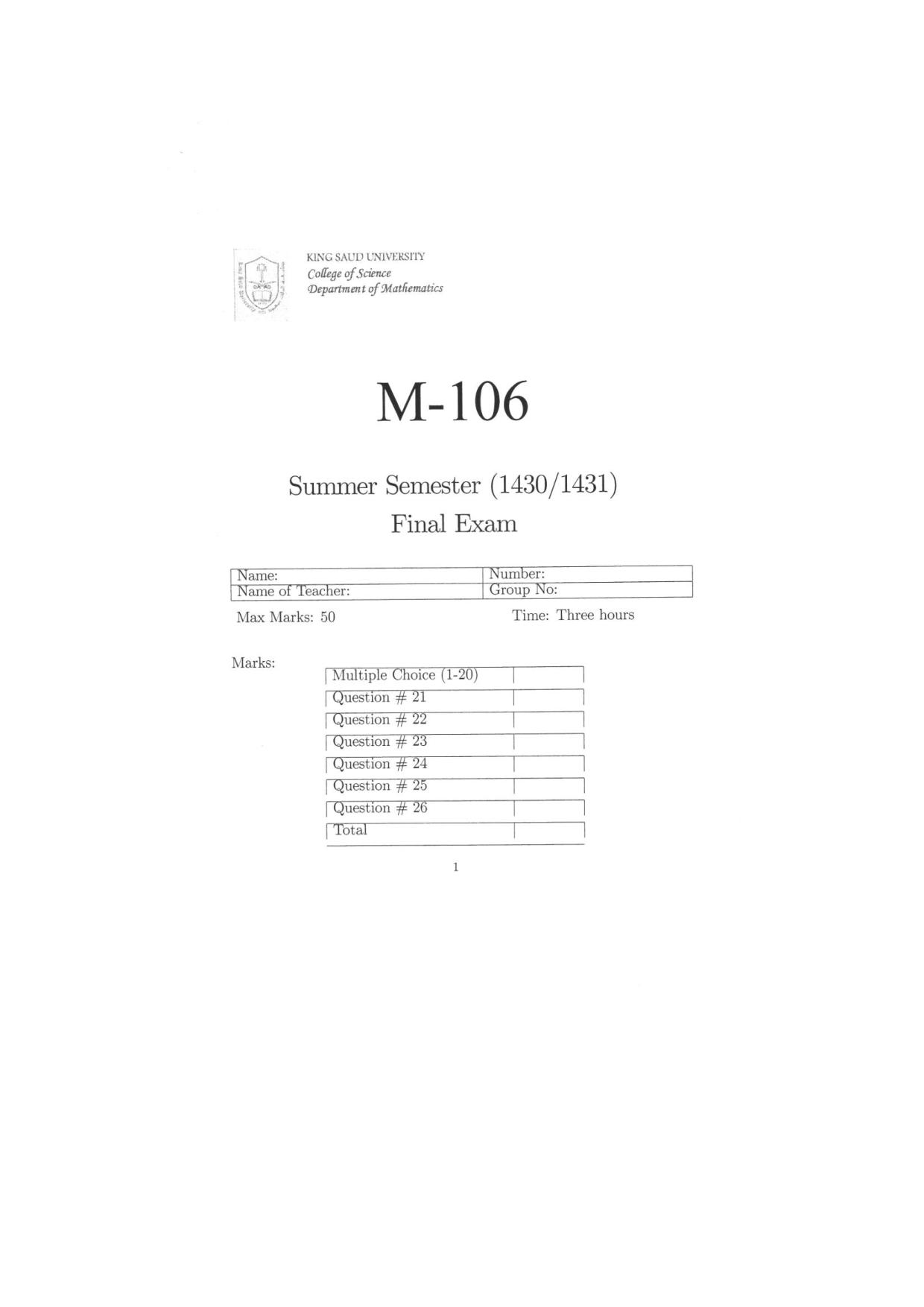 اسئلة اختبارنهائي  ريض 106 حساب التكامل الفصل الصيفي 1431هـ  جامعة المك سعود