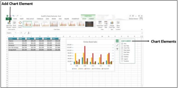 الزر الأول في الشريط هو "إضافة عنصر الرسم البياني" (Add Chart Element) ، وهو يشبه أيقونة "عناصر الرسم البياني" (Chart Elements)، الموجودة في الركن العلوي الأيمن للرسوم البيانية كما هو موضح أدناه