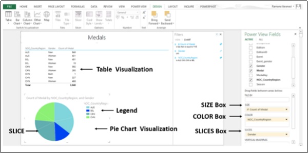 لديك الآن تصور مخطط دائري (Pie Chart Visualization) بسيط حيث يتم عرض عدد الميداليات حسب حجم الدائرة ، والدول حسب الألوان. يمكنك أيضًا جعل تصور الرسم البياني الدائري متطورًا عن طريق إضافة المزيد من الميزات. أحد الأمثلة على ذلك هو شرائح (SLICES).