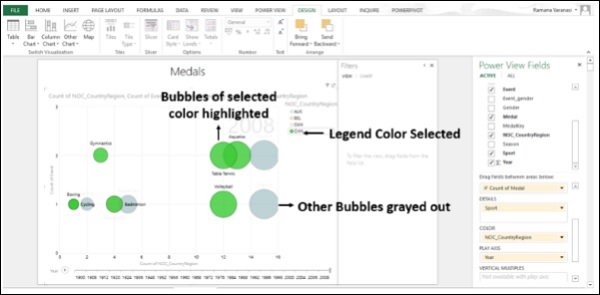 الخطوة 6 - اسحب الحقل (NOC_CountryRegion) إلى مربع اللون. سيتم تلوين الفقاعات بقيم الحقل في مربع اللون.