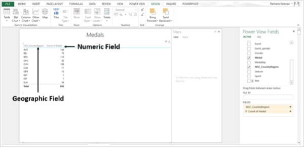 الخطوة 6 - يمكنك أيضًا التحقق من وجود الحقل الجغرافي أسفل قائمة حقول الباورفيو (Power View Fields List) في مربع الموقع (Locations Box) والحقل الرقمي (Numeric Field) في مربع الحجم (Σ SIZE Box).