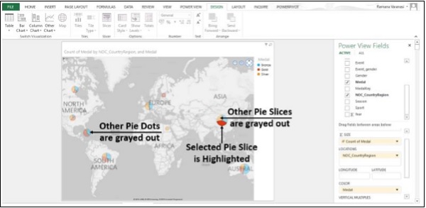 يتحول تصور الجدول (Table Visualization) إلى تصور الخريطة (Map Visualization). ينشئ الباورفيو ( Power View) خريطة بنقطة لكل موقع جغرافي. حجم النقطة هو قيمة الحقل الرقمي المقابل.