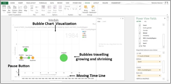 يتحول تصور المخطط المبعثر (Scatter Chart Visualization) إلى تصور المخطط الفقاعي (Bubble Chart Visualization). نقاط البيانات عبارة عن دوائر بالحجم الذي تمثله قيم نقاط البيانات. لون الدوائر هو (X VALUE) ومُعطى في وسيلة الإيضاح (Legend). تسميات البيانات هي قيم الفئات.