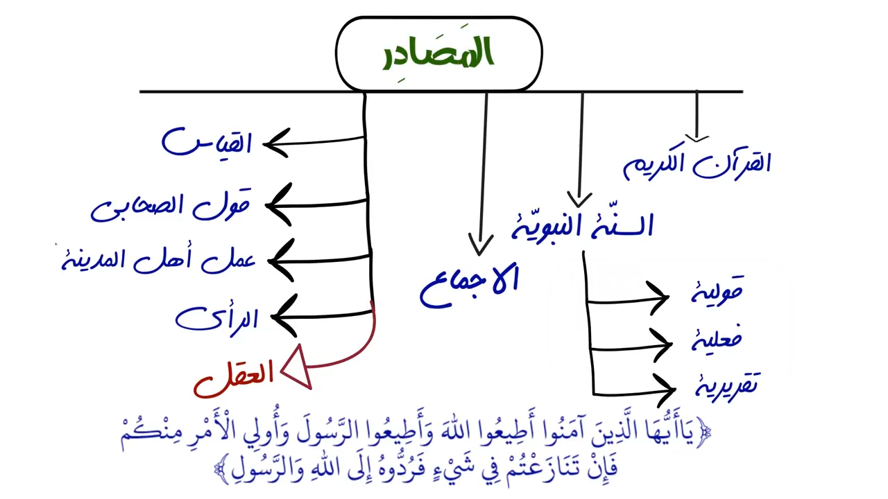 {يَا أَيُّهَا الَّذِينَ آمَنُوا أَطِيعُوا اللَّهَ وَأَطِيعُوا الرَّسُولَ وَأُولِي الْأَمْرِ مِنكُمْ ۖ فَإِن تَنَازَعْتُمْ فِي شَيْءٍ فَرُدُّوهُ إِلَى اللَّهِ وَالرَّسُولِ إِن كُنتُمْ تُؤْمِنُونَ بِاللَّهِ وَالْيَوْمِ الْآخِرِ ۚ ذَٰلِكَ خَيْرٌ وَأَحْسَنُ تَأْوِيلًا} [النساء: 59] فأولاً نقدم (طاعة الله) والمتمثلة بأوامره الموجودة في القرآن الكريم، ثم (طاعة الرسول صلى الله عليه وسلم) في أوامره التي نقلت إلينا في كتب السنة، والتي ما قالها إلا بوحي من الله عز وجل، ثم بعد ذلك (طاعة أولي الأمر) أولي الأمر هم العلماء وليسوا الحكام فطاعة أولي الأمر هنا نعتبرها مصدراً شرعياً إذا أجمعوا فلن يجمعوا على ضلالة، أما إذا اختلفوا فنرجع الأمر إلى الكتاب والسنة كما قال الله عز وجل: